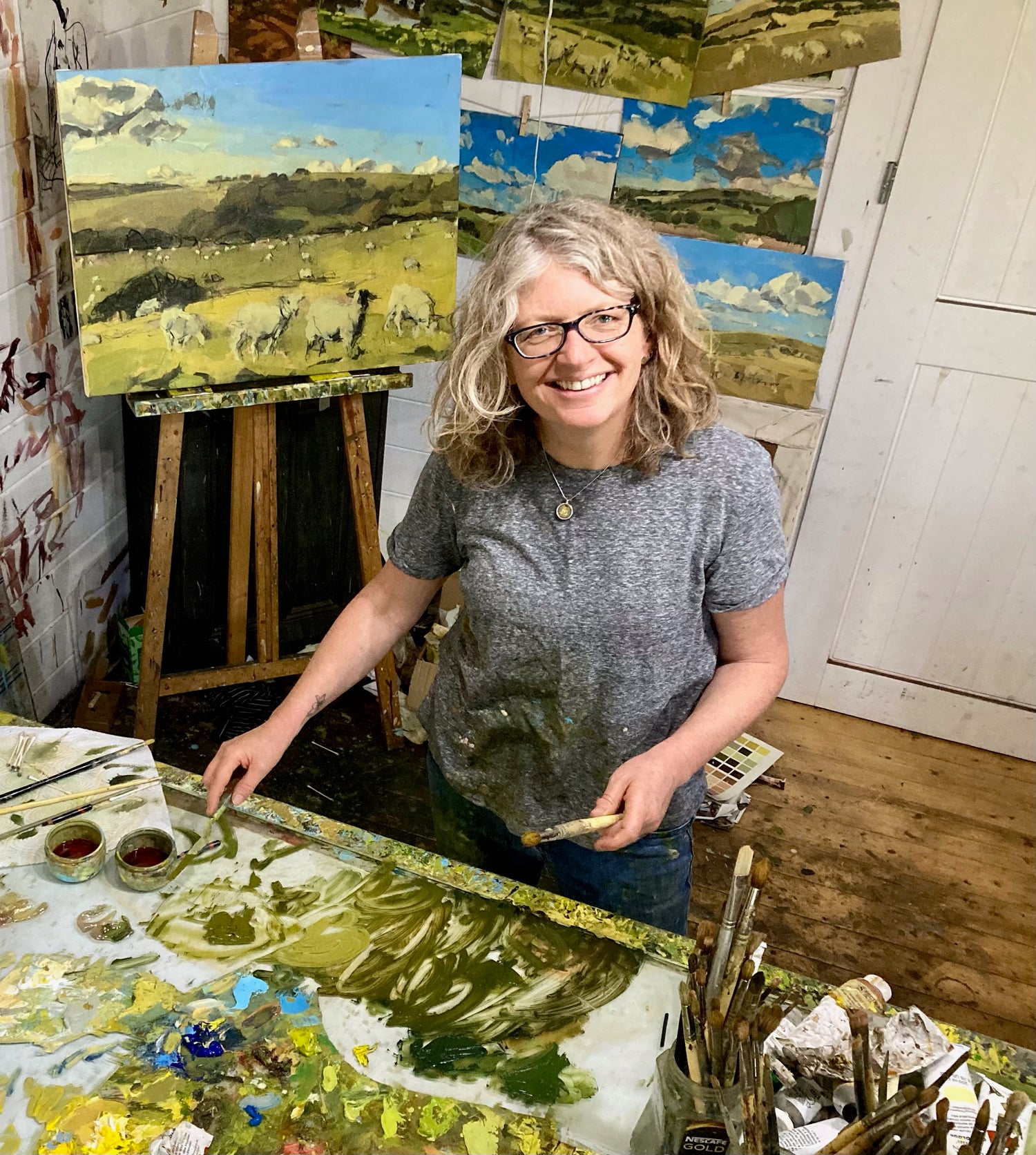 Anna is a British artist living and working in Frome, Somerset. Throughout her career, her work has been inspired by her environment – the people, places, and cultures that surround her. Following graduation from West Sussex college of Art in 1994 with a first class degree, she traveled extensively in India, South East Asia, and Africa, creating figurative work which endeavoured to capture people immersed in their daily lives, offering an insight into the essence of a different culture. Commuters in London and bathers on the beaches of Dorset have also inspired her work but, during the national Covid lockdown, she became fascinated by her local landscape in Somerset. She creates work in oils and charcoal, working directly from life and then refining ideas in the studio. She is most excited working intuitively, directly from life, whether it be a life model in the studio, a flock of sheep in a field or, her most recent obsession, birds in her garden – she finds an intense energy and freedom which, she hopes, is evident in her work.